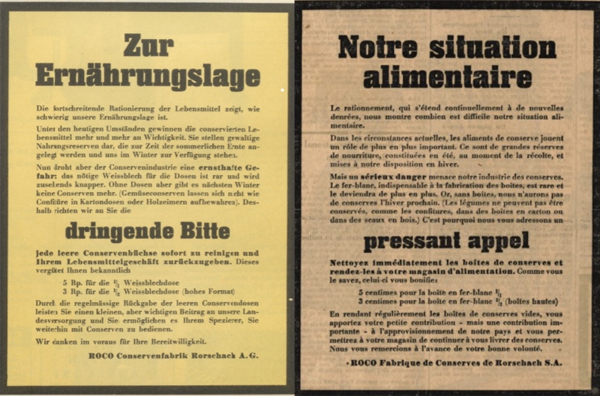 Der Ausbruch des Zweiten Weltkriegs stellte das Unternehmen vor erhebliche Herausforderungen. Zum einen wurden Arbeiter und Angestellte immer wieder in die Armee eingezogen und zum anderen wurde es zunehmend schwieriger, die zu verarbeitenden Agrarrohstoffe (Obst, Gemüse, Zucker), aber auch Blech für die Dosen zu beschaffen. Deshalb schaltete die Firma 1942 ein Inserat, in dem sie aufrief, leere Büchsen zurückzugeben.